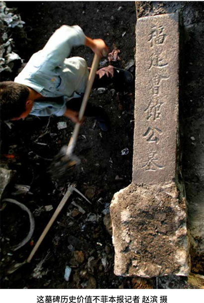 记者在现场看到,墓碑躺在沟边水泥台上,长约1.3米,宽约0.2米,厚约0.15米, 碑身正面楷书镌刻的“福建会馆公墓”十分清晰。工人师傅说,现场还挖到了一些瓷器碎片。为避免破坏还未出土的文物,工地负责人已下令停工。